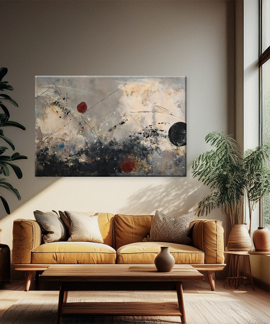 Embodying mystery and quiet strength, Fading Echoes is a minimalist abstract canvas where soft gray and beige tones meet bold strokes of black and subtle touches of red. The scattered textures and delicate lines create a sense of motion suspended...