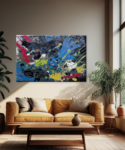 Ignite your walls with Fragments of Energy, a raw and expressive abstract canvas filled with dynamic splashes of red, yellow, green, blue, and deep black. The thick textures and layered strokes create an intense sense of movement, as if energy...