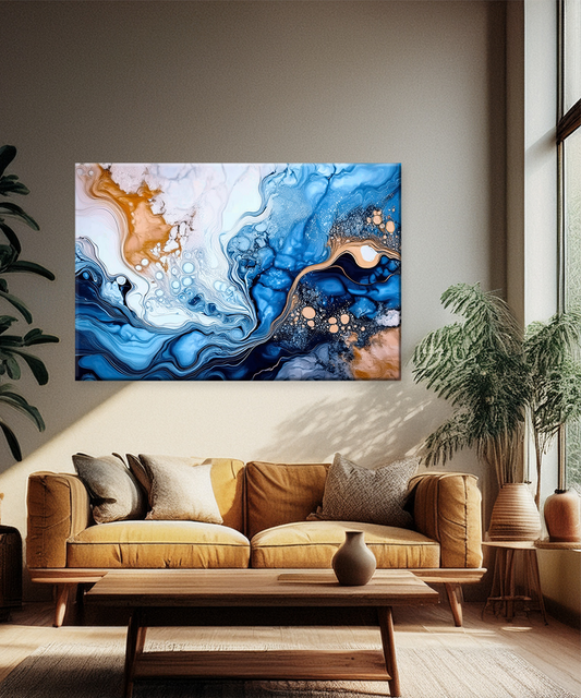Immerse yourself in the tranquil beauty of Blue Genesis, a breathtaking abstract canvas that flows like ocean waves meeting golden shores. Rich tones of deep indigo, sapphire, and turquoise intertwine with warm gold accents, creating a mesmerizing sense of depth...