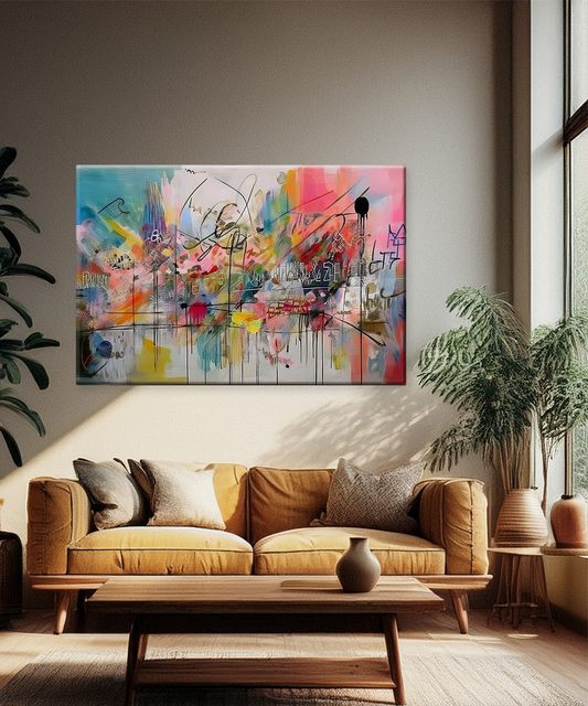 Immerse your space in a vibrant explosion of color and movement with this mesmerizing abstract expressionist canvas wall art. Featuring bold brush strokes, layered textures, and energetic splashes of pink, turquoise, yellow, and black, it creates a dynamic balance between...