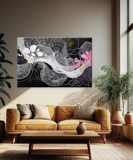A modern abstract canvas featuring intricate white linework and delicate pink floral highlights over a dark background. Add a touch of elegance and mystery to your interior with this Abstract Line Art Canvas Wall Art. The design showcases flowing white...