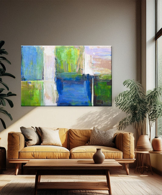 A modern abstract canvas featuring layered color blocks in blue, green, beige, and soft pastel shades. Bring contemporary style and artistic depth into your home with this Abstract Geometric Canvas Wall Art. The design showcases bold blocks of color—ranging from...