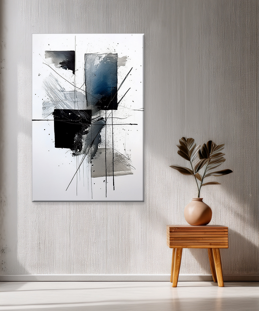 Modern, bold, and sophisticated — this abstract minimal canvas wall art features layered brushstrokes, ink lines, and geometric contrasts in shades of black, grey, and deep blue. Printed with Epson professional printers and Chrome 12 inks, it guarantees crisp detail,...