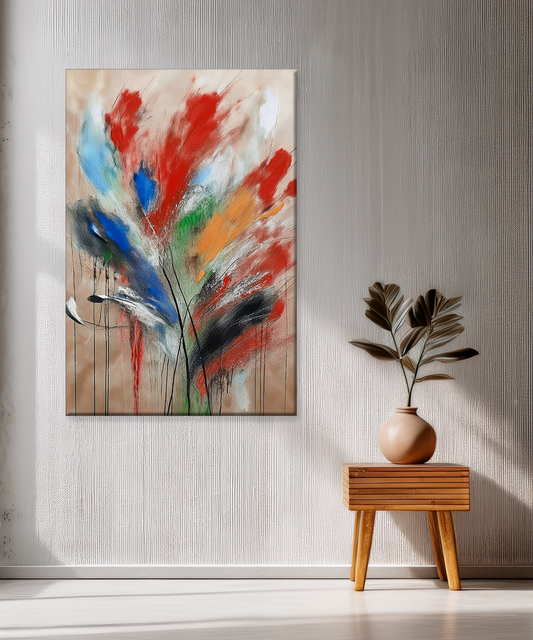Bold, expressive, and full of movement — this abstract floral canvas wall art captures the beauty of nature through powerful strokes of red, blue, green, orange, and black on a soft neutral background. Printed with Epson professional printers and Chrome...