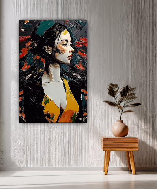 A striking portrait infused with bold textures and vibrant contrasts, this artwork blends realism with expressive abstraction. The figure’s serene profile, framed by flowing strokes of deep red, green, and gold, radiates elegance and strength—making it a captivating statement piece...