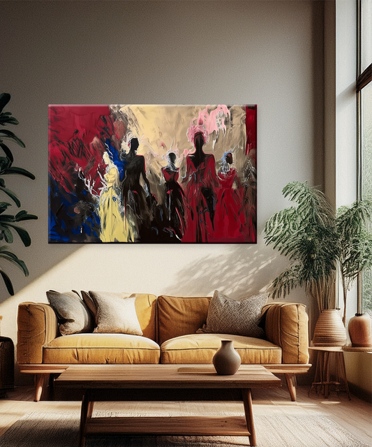 A dramatic abstract canvas featuring human silhouettes in deep red, black, and golden tones with expressive textures. Make a bold statement in your space with this Abstract Figurative Canvas Wall Art, a powerful composition blending abstract expression with human form....