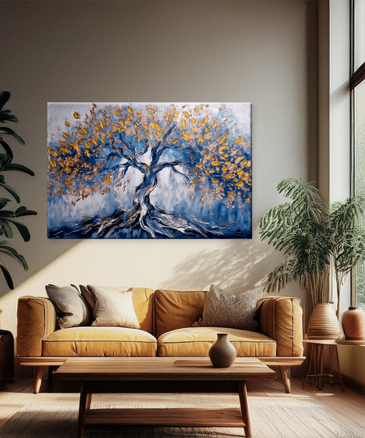 A textured abstract canvas featuring a majestic tree of life with golden leaves and deep blue tones. Add elegance and symbolism to your walls with Golden Blue Tree of Life, a textured abstract canvas artwork that blends rich blue shades...