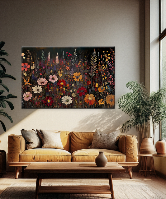 A dramatic textured canvas of wildflowers blooming against a dark backdrop, full of depth and vibrant color. Transform your walls with the bold beauty of Wildflowers in the Dark, a richly textured abstract floral canvas. Featuring a stunning variety of...