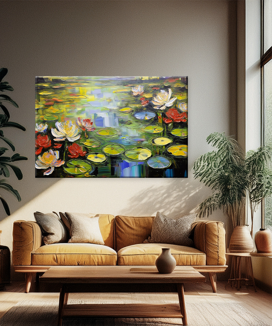 Add a touch of tranquility and elegance to your home with this stunning water lily canvas wall art. Inspired by impressionist masters, the artwork features delicate white and red lotus flowers floating gracefully among green lily pads, reflecting the golden...