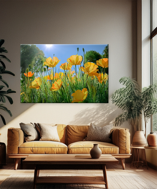 Capture the radiant beauty of nature with this golden poppy canvas wall art. Bathed in warm sunlight, the delicate yellow-orange blossoms stretch toward a clear blue sky, celebrating the joy and freedom of California’s iconic wildflowers. Perfect for adding a...