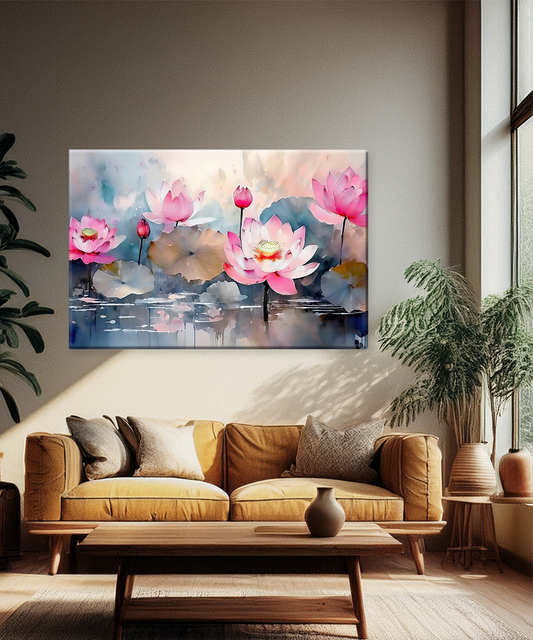 A dreamy abstract canvas featuring pink lotus flowers and water lilies floating gracefully on calm waters. Bring serenity and elegance into your home with Lotus Dreams, an abstract floral canvas that captures the ethereal beauty of lotus flowers. With soft...
