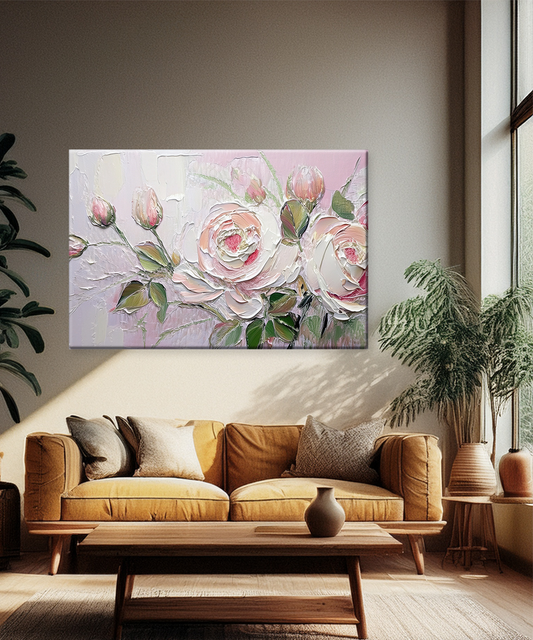 A romantic textured canvas featuring abstract roses in soft blush tones, adding warmth and elegance to your space. Bring timeless romance and artistic charm into your home with Whispers of Roses, a textured abstract canvas artwork. Delicately painted in soft...