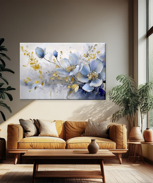 A delicate abstract canvas of soft blue and golden flowers, bringing elegance and serenity to your living space. Infuse your home with grace and tranquility through Whispers in Bloom, a stunning abstract floral canvas artwork. Featuring soft blue petals accented...