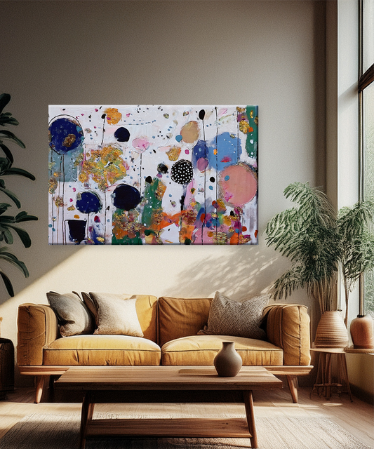 Illuminate your walls with Golden Rhythm, a stunning abstract canvas where playful circles, textured brushstrokes, and shimmering golden accents unite in perfect harmony. The vibrant palette of navy, blush, green, and soft pastels creates a whimsical yet elegant design that...