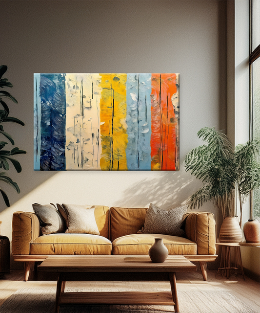Bring harmony and bold sophistication to your walls with Echoes in Lines, a striking abstract canvas featuring vertical bands of deep blue, golden yellow, soft beige, sky blue, and fiery orange. Subtle textures and fine linear details add depth and...