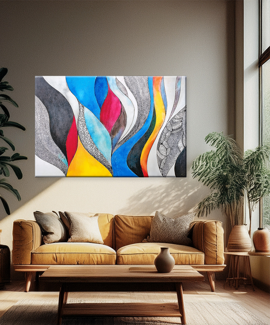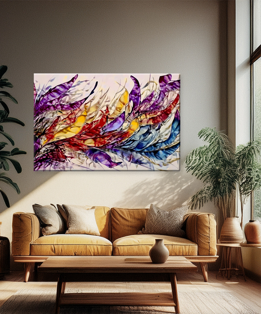 Unleash the power of movement and vibrancy with Flames of Color, a captivating abstract canvas that bursts with sweeping strokes of crimson, violet, golden yellow, and deep blue. Its fluid forms resemble dancing flames or wind-swept feathers, creating a mesmerizing...