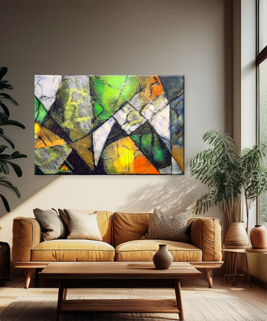 Bring a sense of natural harmony into your home with Verdant Echoes, a geometric abstract canvas infused with earthy greens, golden yellows, and warm oranges. Sharp angles and layered textures intertwine with organic tones, creating a captivating balance between structure...