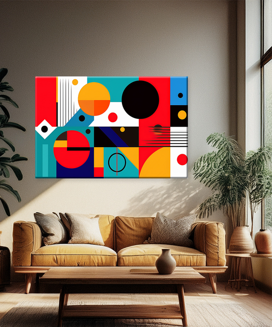 Transform your walls with the striking energy of this geometric abstract canvas wall art. Featuring a bold interplay of circles, lines, and blocks of vivid red, yellow, turquoise, black, and white, this piece radiates balance, rhythm, and modern sophistication. Its...