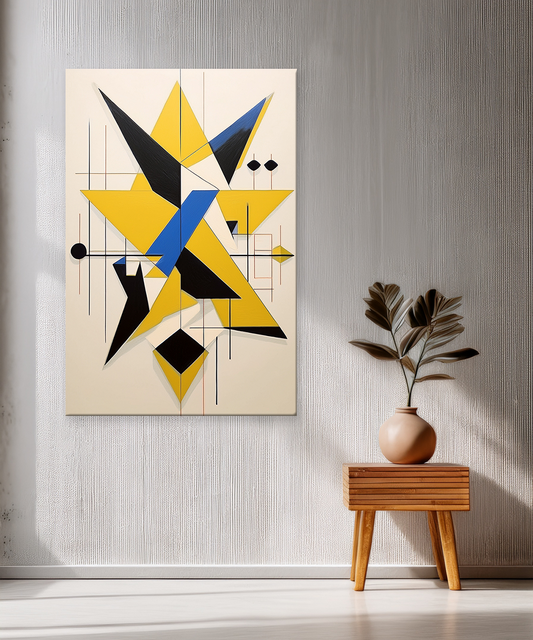 This modern geometric canvas wall art features bold triangular shapes in striking yellow, blue, and black tones, creating a clean and dynamic visual impact. Printed with Epson printers using Chrome 12 inks, the artwork stays vibrant and fade-resistant for up...