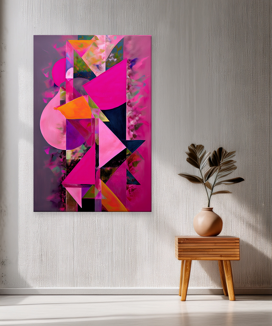 This neon-inspired abstract canvas wall art bursts with vibrant pink, orange, and purple tones, balanced by sharp geometric shapes. Printed with Epson printers using Chrome 12 inks, it guarantees vivid colors and fade resistance for up to 200 years. A...