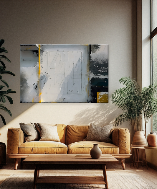 Minimal abstract artwork with subtle grey tones and bold yellow accents, creating a modern and contemplative atmosphere. “Traces of Silence – Minimal Abstract Canvas Wall Art in Grey, Black, and Yellow Accents” embodies quiet sophistication through its restrained color palette...