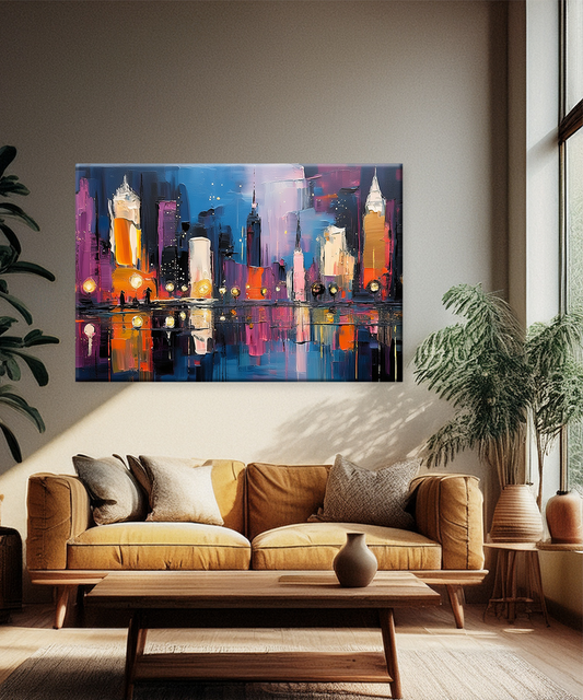 Colorful abstract city skyline at night with glowing lights and reflections, perfect for modern urban interiors. “City Lights Symphony – Vibrant Night Skyline Reflections Canvas Wall Art” brings the magic of the city at night to life with dazzling lights,...