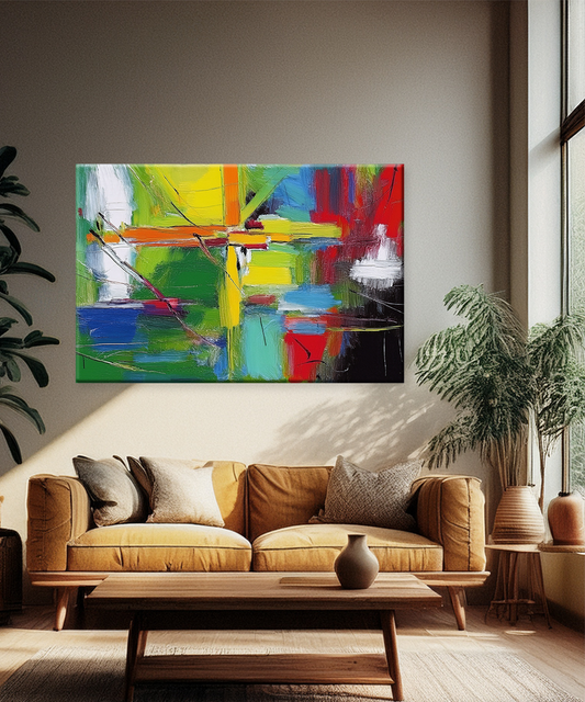 Striking abstract artwork with bold geometric strokes in vivid red, yellow, green, and blue tones, ideal for modern interiors. “Vivid Harmony – Bold Abstract Geometric Expression Canvas Wall Art” radiates energy through its vibrant palette of red, yellow, green, and...