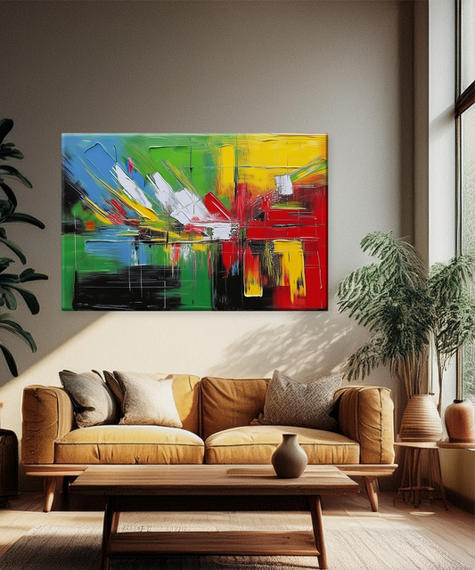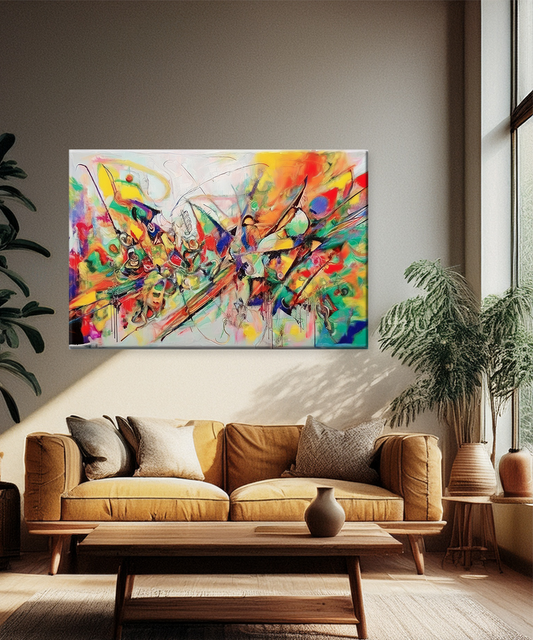 Dynamic explosion of vivid colors and bold strokes, a powerful statement piece for modern interiors. “Rhythms of Chaos – Vibrant Abstract Expressionist Canvas Wall Art” bursts with energy through its bold strokes, vivid splashes of red, green, yellow, and blue,...