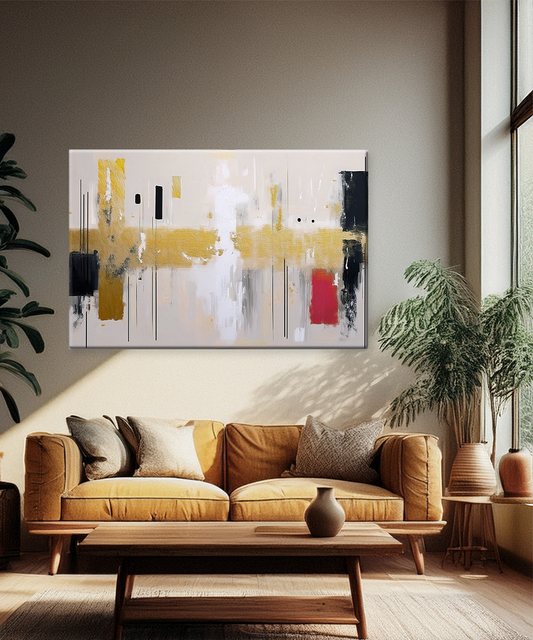 Bold abstract brushstrokes in gold, black, and red tones, adding a modern artistic statement to any space. “Minimal Echoes – Abstract Geometric Brushstrokes in Gold, Black, and Red Canvas Wall Art” features a striking blend of textured gold accents, bold...