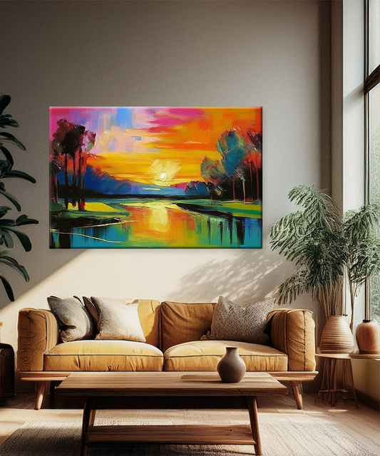 Vivid impressionist sunset landscape with bold reflections, bringing warmth and energy to any interior. “Radiant Sunset Reflections – Abstract Impressionist Landscape Canvas Wall Art” captures the breathtaking beauty of a glowing sunset reflected across calm waters. Painted in vibrant shades...