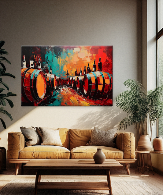 Expressive wine cellar scene with glowing barrels and rich colors, ideal for wine lovers and rustic interiors. “Cellar of Fire – Vibrant Wine Cellar with Barrels and Bottles Canvas Wall Art” immerses you in the warm and inviting atmosphere of...