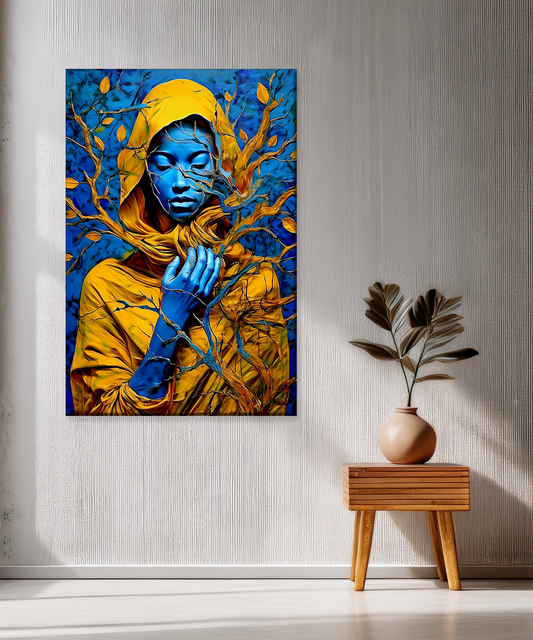 This mesmerizing canvas portrays a serene blue figure cloaked in golden fabric, intertwined with branches and leaves. The vivid contrast of deep blue and radiant gold creates a dreamlike, spiritual atmosphere. Printed with Epson technology and Chrome 12 pigment inks,...