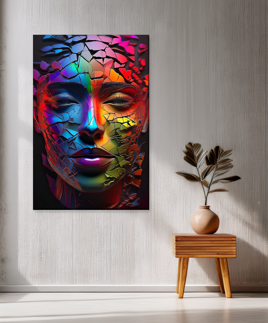 This bold canvas showcases a fragmented face glowing in a spectrum of vivid rainbow colors. The cracked, glass-like textures create a stunning balance of beauty and intensity, making it a striking focal point. Printed with Epson technology and Chrome 12...
