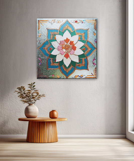 Infuse your space with harmony, elegance, and spiritual beauty through “Sacred Bloom,” a mesmerizing mandala canvas featuring intricate floral patterns in teal, gold, pink, and white. Symbolizing balance and enlightenment, this artwork blends traditional motifs with contemporary artistry, radiating peace...