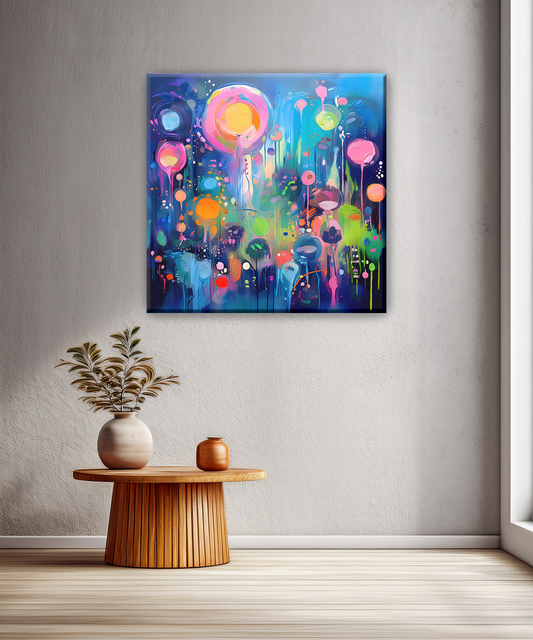 Transform your walls into a festival of light and energy with “Cosmic Neon Kaleidoscope,” a dynamic abstract canvas bursting with vibrant colors. Bold splashes of pink, orange, green, and electric blue dance across a deep indigo background, creating a mesmerizing...