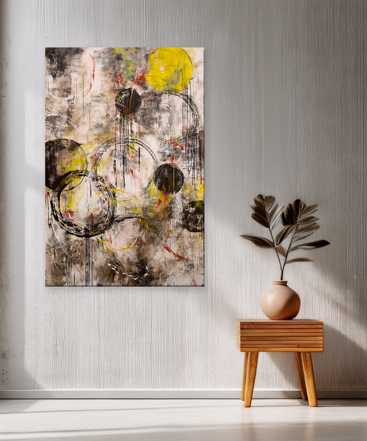 This expressive abstract canvas wall art features bold circular forms in yellow, black, and grey tones, enhanced with dynamic paint splashes and textured layers. Printed with Epson printers using Chrome 12 inks, it ensures vivid colors and fade resistance for...