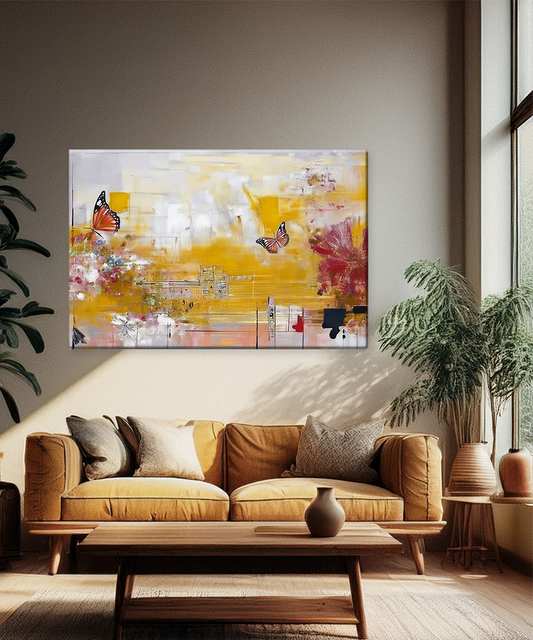 A delicate abstract canvas featuring butterflies, floral textures, and golden-yellow tones in a modern mixed media style. Add charm and elegance to your walls with this Butterfly and Floral Abstract Canvas Wall Art, a stunning mixed media composition blending nature...