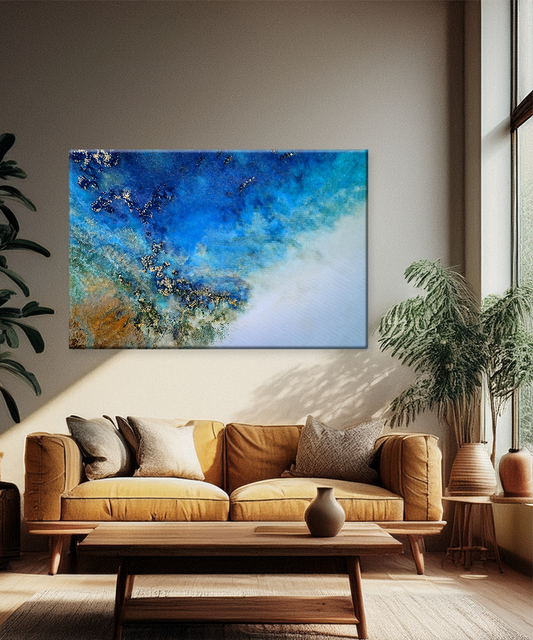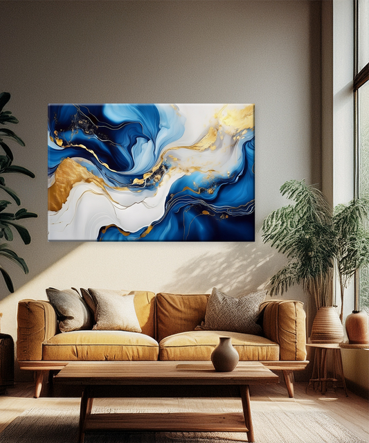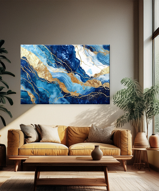 Flowing blue and white marble textures with radiant golden veins create a luxurious and calming abstract masterpiece. Immerse yourself in the elegance of Golden Ocean Veins, a mesmerizing abstract canvas that fuses deep ocean blues with shimmering golden accents. Resembling...
