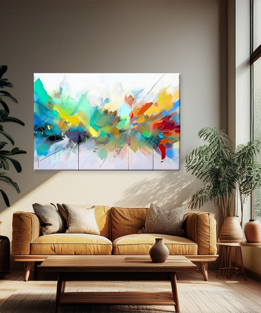 A lively burst of color and movement, blending bold strokes of turquoise, yellow, red, and green in an abstract modern flow. Infuse your space with dynamic energy through Vibrant Energy Flow, an abstract modern canvas that celebrates motion and color....