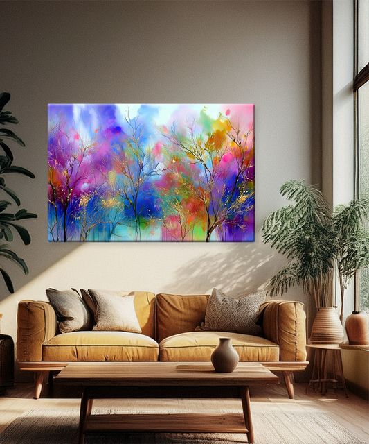 Delicate tree branches set against a vibrant explosion of colors, blending nature with abstract artistic beauty. Bring the magic of nature and color into your home with Symphony of Colors, an enchanting abstract botanical canvas. Featuring delicate tree branches adorned...