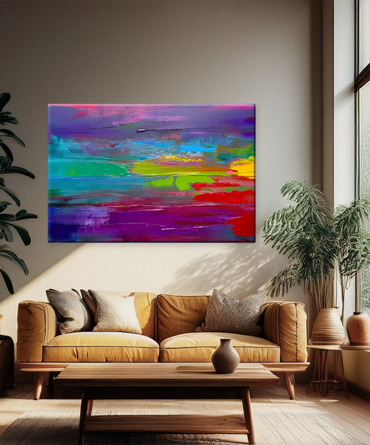 A lively abstract canvas painting featuring bold brushstrokes in purple, green, blue, red, and yellow tones. Brighten up your walls with this Colorful Abstract Canvas Wall Art, a dynamic explosion of color and texture. With expressive layers of purple, teal,...
