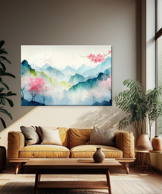 Bring serenity and elegance to your home with this watercolor-style canvas wall art, featuring misty blue mountains and blooming cherry blossoms. Immerse yourself in tranquility with the Whispers of Spring Canvas Wall Art. This delicate watercolor-style artwork portrays soft blue...
