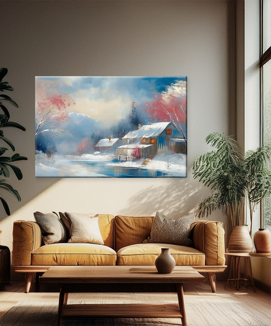Bring cozy elegance to your walls with this winter canvas wall art, featuring snowy cabins, glowing lights, and a serene frozen lake. Add warmth and tranquility to your home with the Winter Serenity Canvas Wall Art. This painting-style artwork captures...