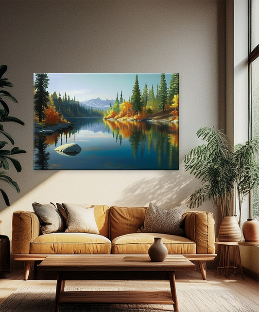 Add peaceful elegance to your walls with this canvas wall art, featuring golden autumn trees mirrored in a tranquil mountain lake. Celebrate the serenity of nature with the Golden Reflection Canvas Wall Art. This artwork depicts a crystal-clear mountain lake...