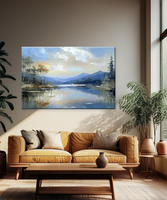 Add peaceful elegance to your home with this canvas wall art, featuring a textured painting of a serene blue lake surrounded by mountains and forests. Bring calm and artistic charm to your walls with the Tranquil Blue Lake Canvas Wall...