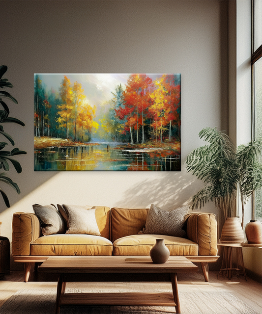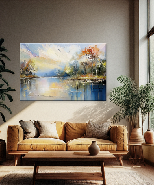 Bring serenity to your décor with this canvas wall art, featuring a textured autumn forest and calm reflective lake in an abstract painting style. Immerse your home in the peaceful beauty of the Tranquil Lake Canvas Wall Art. This artwork...