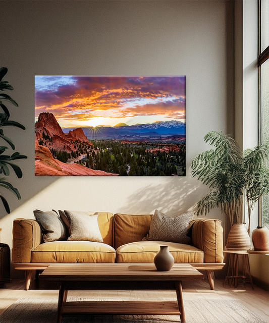 Add dramatic beauty to your space with this canvas wall art, featuring fiery red rock formations, green forests, and glowing mountain sunsets. Bring the raw beauty of the American Southwest into your home with the Sunrise Over Red Rocks Canvas...