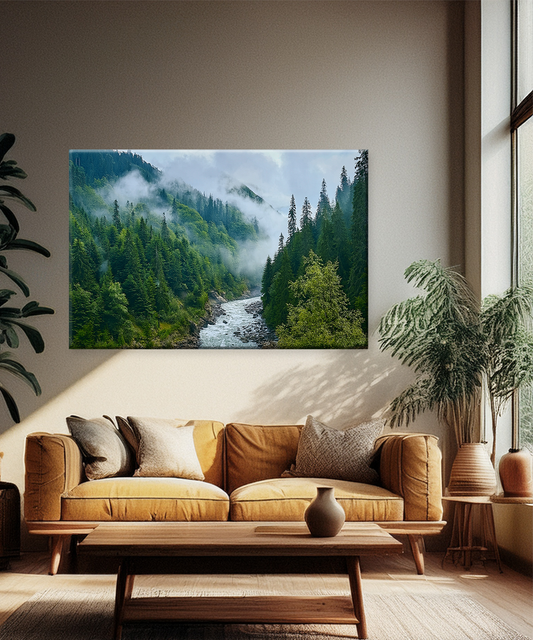 Add depth and tranquility to your home with this canvas wall art, featuring misty pine forests and a flowing mountain river. Bring the serene magic of nature into your space with the Whispers of the Forest Canvas Wall Art. This...