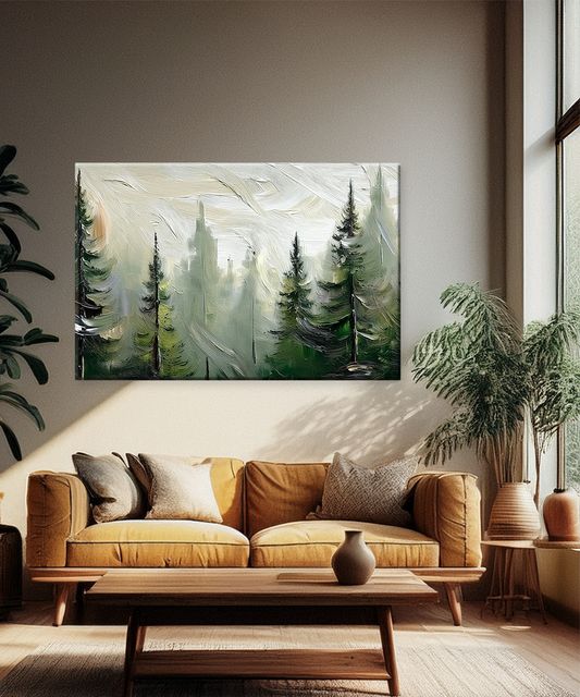 Bring natural calm into your home with this textured canvas wall art, featuring misty pine trees painted with expressive brushstrokes. Discover the quiet strength of the forest with the Silent Pines Canvas Wall Art. This artwork captures a mist-covered pine...