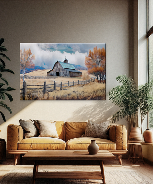 Bring the warmth of autumn countryside into your home with this rustic barn canvas wall art, featuring golden fields, colorful trees, and serene mountain views. Transform your walls with the timeless charm of rural life. This Rustic Countryside Barn Canvas...